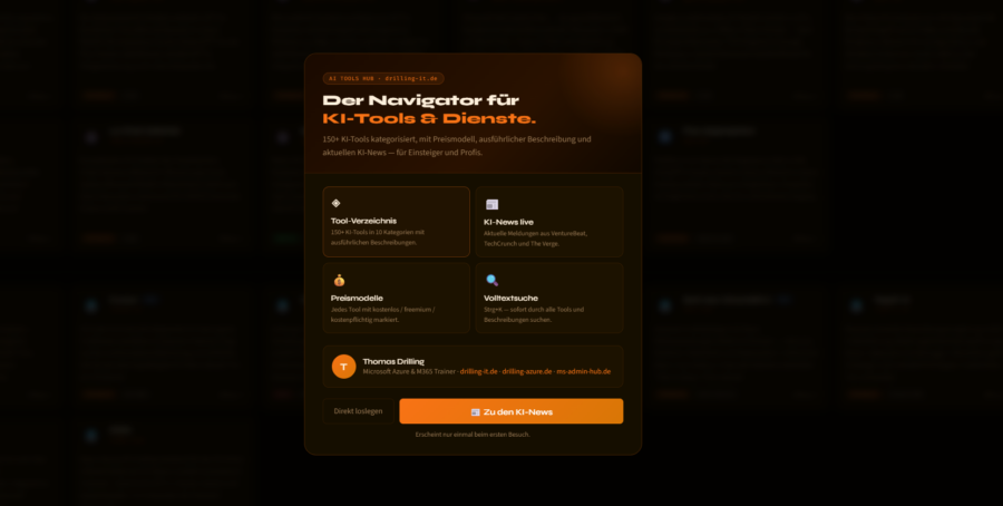 Im Rahmen eines kleinen Programmierprojektes im Kontext meiner Trainings sind zwei hübsche kleine neue Landingpages ms-admin-hub.de und ki-tooL-hub.de entstanden. Nichts besonderes und in ähnlicher Form auch an anderen Stellen im Netz zu finden, aber wie ich persönlich finde optisch gut gelungen und hier mit Schwerpunkt auf den deutschsprachigen Raum.